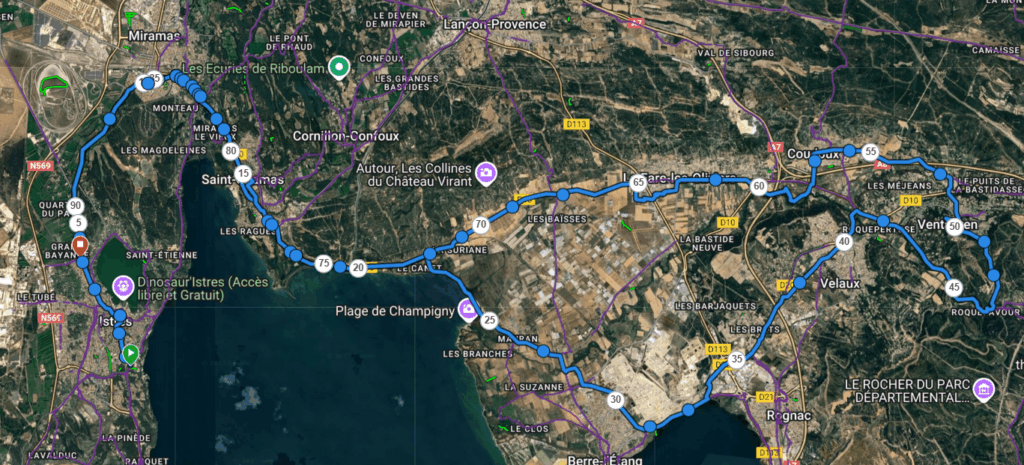 Parcours Samedi 01 Novembre 2025 – 9h00 Posté par Franck Guerra | 31 Oct 2025 | Divers 90km Istres – Miramas – St Chamas – Mauran – Berre – Velaux – Roquefavour – Cote de Ventabren – Coudoux – La Fare – St Chamas – Miramas – Istres