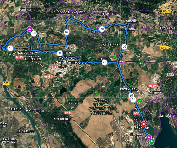 Istres – Entressen – St Martin de Crau – Arles – Pont de Crau – Montée de Barbegal – Maussane les Alpilles – Mouries – Aureille par Route des Oliviers – Entressen – Istres