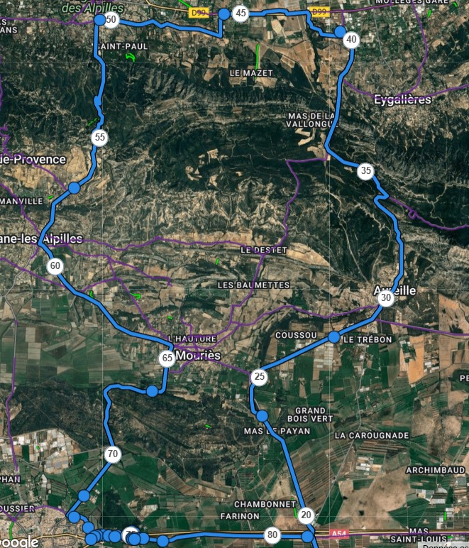 Istres – Entressen – Coussou – Aureille – Pas de la Figuière – St Remy de Provence – Les Antiques – Massane les Alpilles – Mouries – St Martin de Crau – Entressen – Istres