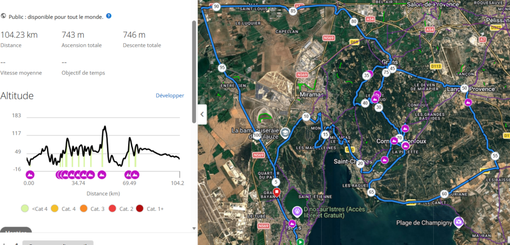 Istres – Miramas – Cimetière – Les Magdeleines – Montée Miramas le Vieux – Saint Chamas – Cornillon par le camping – 2 boucles de la Touloubre – Grans – Lancon – Montée des Baisses – St Chamas – Cornillon – Mary Rose – Péage de Miramas – Entressen – Istres